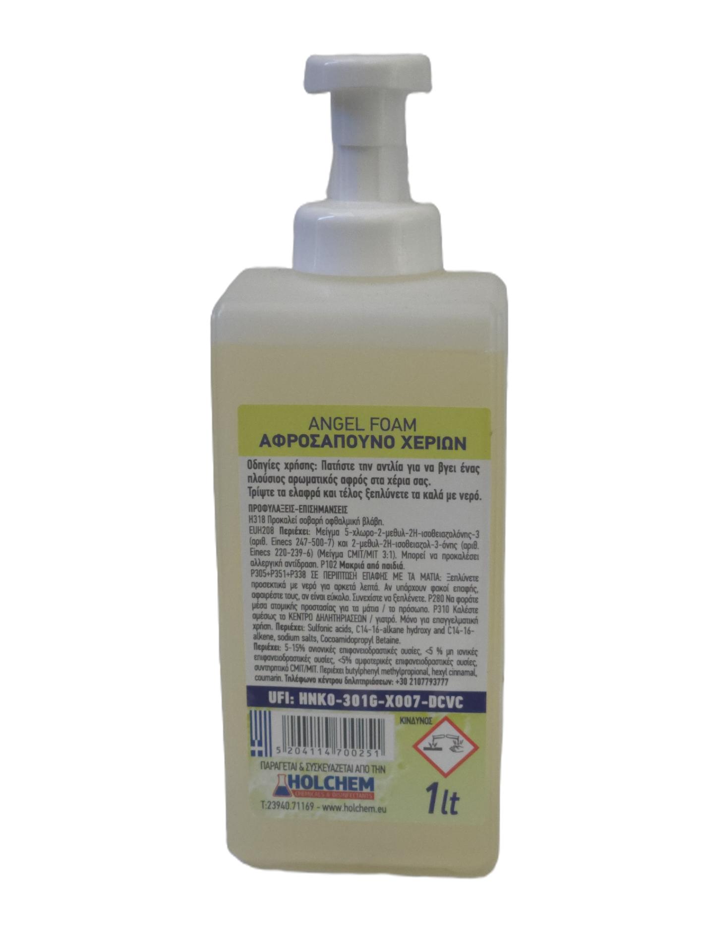 Το ANGEL FOAM είναι ένα υγρό αφροσάπουνο χεριών που προσφέρει πλούσιο αφρό και ευχάριστο άρωμα. Η ειδική του σύνθεση δεν καθαρίζει μόνο τα χέρια, αλλά και τα περιποιείται, κάνοντάς το ιδανικό για καθημερινή χρήση. Το προϊόν σχεδιάζετε έτσι ώστε να εξασφαλίζει αποδεδειγμένη αποτελεσματικότητα στον καθαρισμό των χεριών, ενώ συγχρόνως προσφέρει μια ευχάριστη αίσθηση φρεσκάδας.